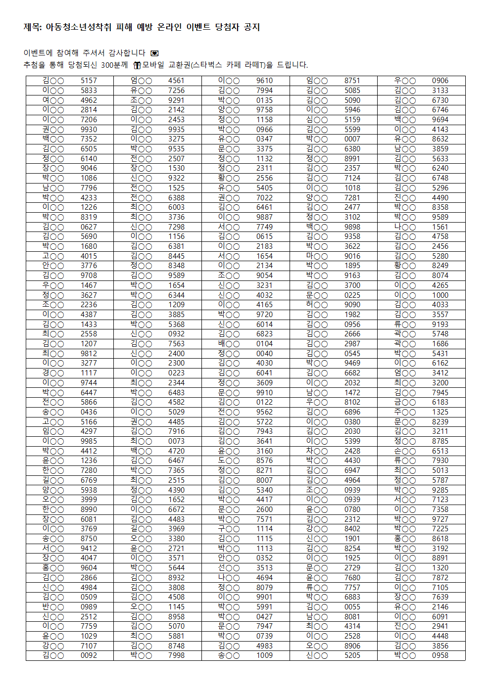아동청소년성착취 피해 예방 온라인 이벤트 당첨자 공지